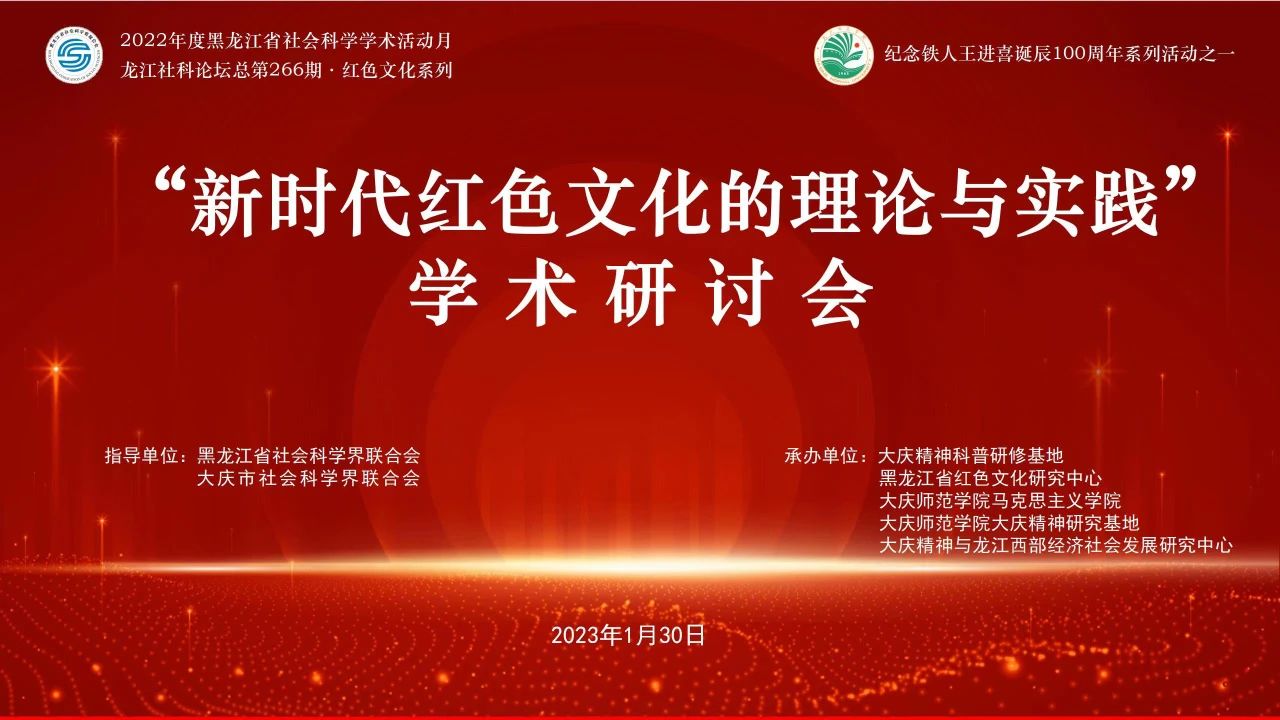 为深入贯彻落实党的二十大精神,弘扬伟大建党精神,不断开辟新时代龙江红色文化研究新境界,促进红色文化在培养时代新人中的实践运用,2023年1月30日,龙江社科论坛“红色文化”系列“新时代红色文化的理论与实践”学术研讨会在大庆师范学院以线上形式召开,本次论坛为黑龙江省社会科学学术活动月主题活动和纪念铁人王进喜诞辰100周年系列活动。论坛由黑龙江省社会科学界联合会和大庆市社会科学界联合会指导,大庆师范学院主办,大庆精神科普研修基地、黑龙江省红色文化研究中心、大庆师范学院马克思主义学院、大庆师范学院大庆精神研究基地、大庆精神与龙江西部经济社会发展研究中心承办。大庆师范学院党委副书记、大庆精神研究基地主任王革教授致辞。来自省内外20多所高校和研究机构的150余名专家学者参与论坛。