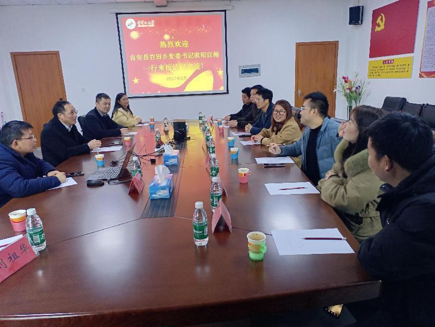 刘祖文对吉安县官田乡党委书记欧阳红梅一行表示欢迎,并介绍了学校的基本情况。指出井冈山大学长期以来,坚持以井冈山精神办学育人,充分发挥地处井冈山区域的优势,将红色资源转化为学校的人才培养优势,科学研究和学科发展优势,取得了良好的社会影响。同时,学校还积极加强与地方政府的合作,服务地方社会经济发展。学校愿意发挥科技、人才等资源优势,加强与官田乡就开发红色资源、推动乡村振兴、打造红色旅游品牌等合作。