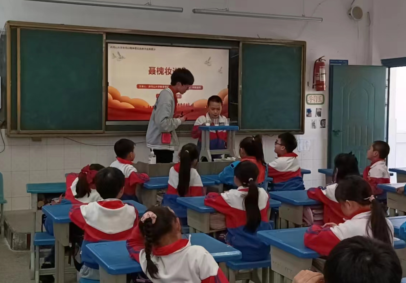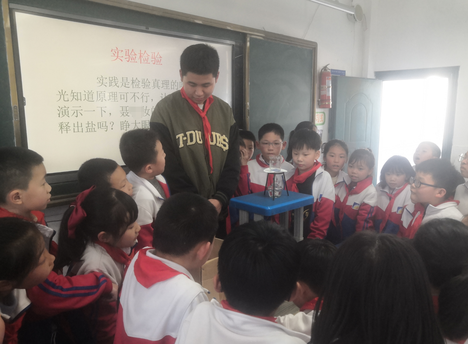 小分队由辨别日常调味品入手,深入挖掘“聂槐妆妙计送盐”中的科学元素——盐的功用、溶解与提取,使孩子们在学习红色故事的同时,切实感受、认知“妙计送盐”背后的化学知识。课堂上红色小分队成员综合运用实物辨别、影像学习、故事讲解、运盐体验、实验观察等多元教学手段,让红色文化在课堂上“活”起来。不仅引导小学生在参与中体验聂槐妆的勇气与智慧,认识遇事冷静、善于观察、勤于思考的重要性,更激发了授课大学生自觉当好红色基因的传承和实践者。