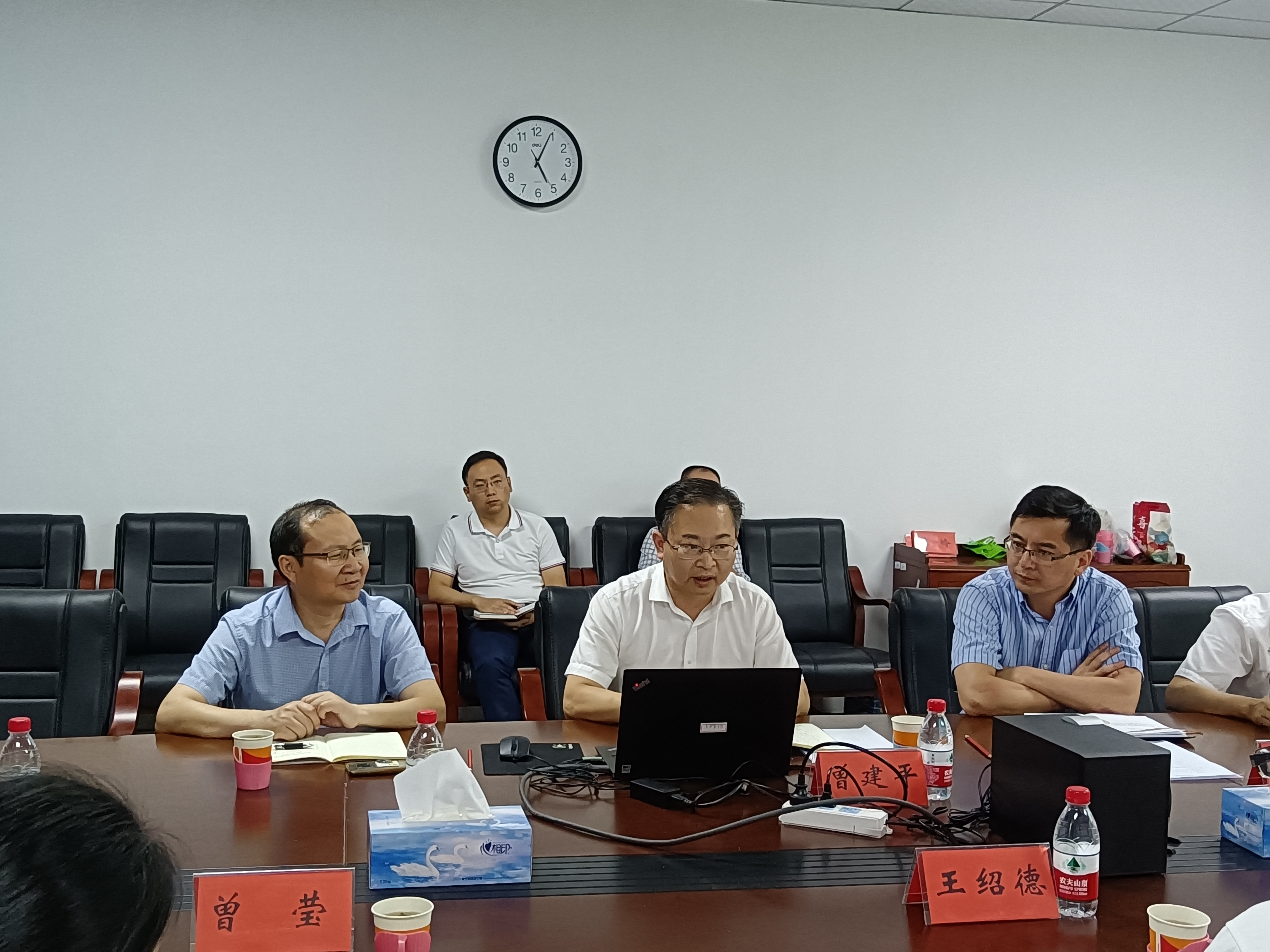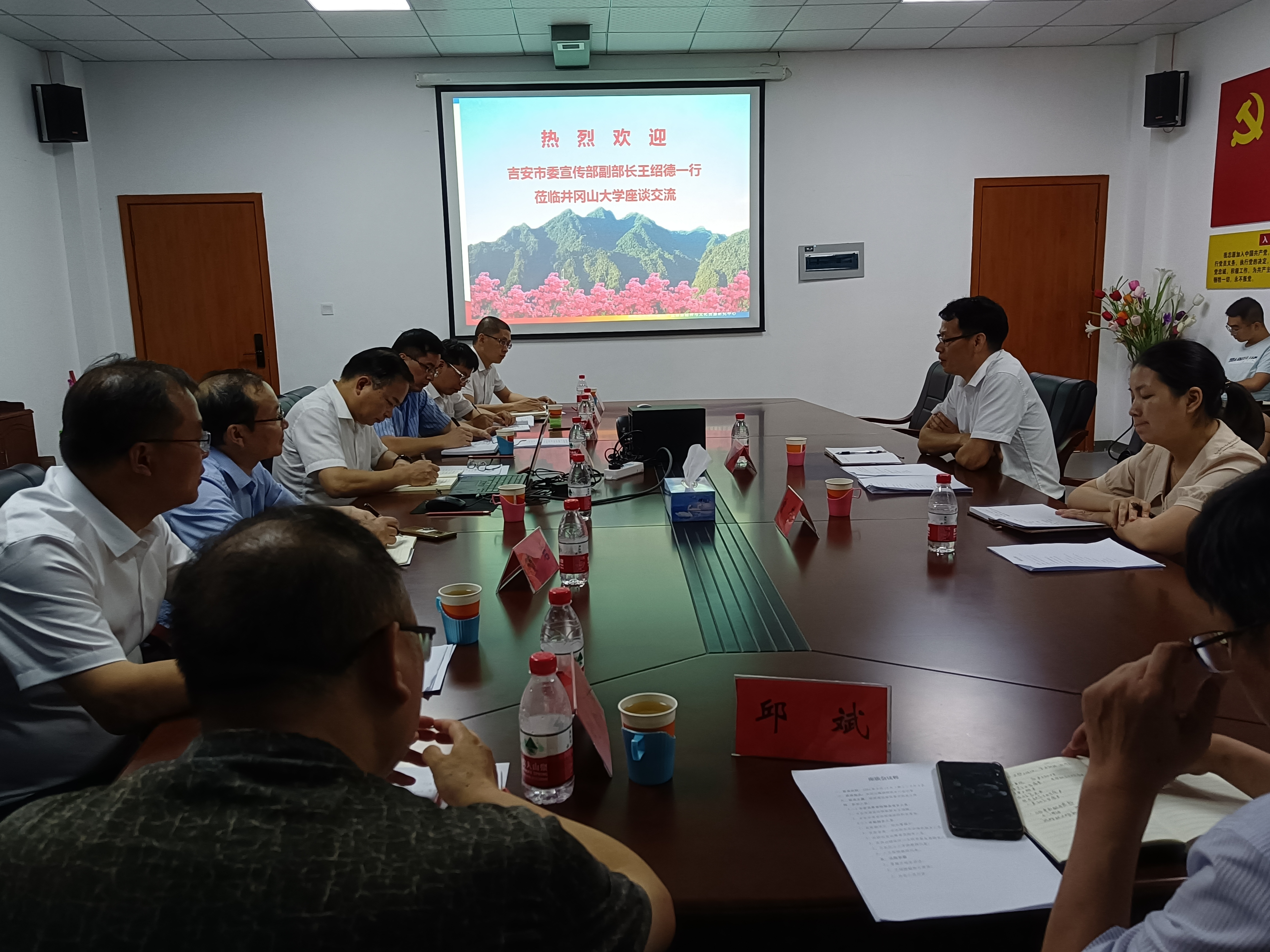 6月15日下午,吉安市委宣传部副部长王绍德一行来我校,就进一步做好红色文化研究和宣传工作开展座谈交流。党委副书记、校长曾建平出席并讲话,党委常委、副校长陈小林、黄俭根,党委常委、宣传部长肖洪海出席,科研处负责人主持会议。井冈山研究中心负责人及相关人员、马克思主义学院和人文学院教师代表参加了座谈。
