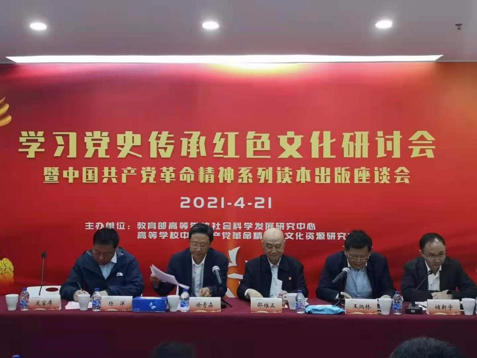 为庆祝中国共产党成立100周年,学习贯彻习近平总书记在党史学习教育动员大会上的重要讲话精神,推动中国共产党革命精神谱系研究和红色文化育人工作。4月21日,由教育部高等学校社会科学发展研究中心、高等学校中国共产党革命精神与文化资源研究中心主办的“学习党史传承红色文化研讨会暨中国共产党革命精神系列读本出版座谈会”在北京图书大厦举行。解放军后勤指挥学院一级教授、少将邵维正,教育部社科司司长徐青森,教育部高等学校社会科学发展研究中心主任王炳林等出席会议。中心主任张泰城教授应邀参加会议。