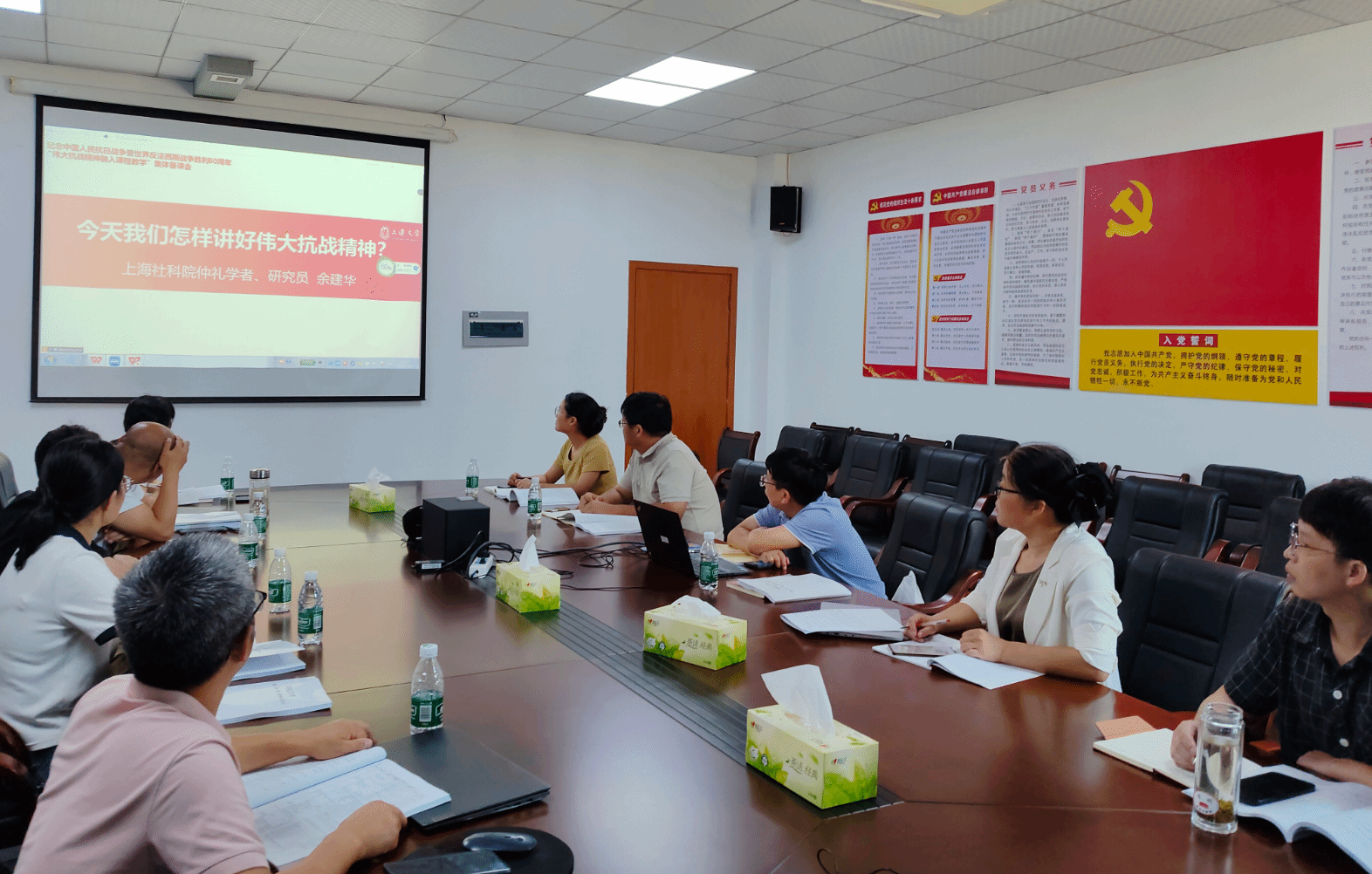 结合上海大学线上分享,中心主任肖发生同志号召中心支部全体党员,一要学理深耕,认真研读习近平总书记在纪念大会上的重要讲话,努力推出学理化、体系化阐释成果;二要课堂落地,树立教研互长意识,用研究性思维把抗战精神深度融入课堂教学。