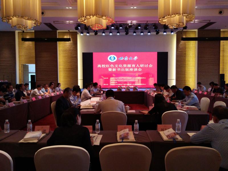 9月21日,红色文化资源育人研讨会暨《高校红色文化资源育人发展报告(2017)》出版座谈会在西南大学举行。教育部高等学校社会科学发展研究中心主任王炳林、中央党史和文献研究院相关负责人刘学礼、重庆市委党史研究室副主任徐光煦、西南大学校长张卫国、人民出版社教育出版中心总编辑刘智宏等出席会议。来自8所高校研究基地以及参与新书编写的有关高校专家学者共80余人参加会议。中心主任张泰城教授、副主任肖发生博士参加了会议。