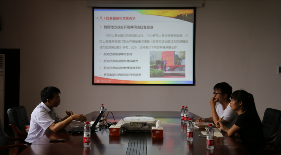 中心副主任肖发生从基础设施、科学研究、人才培养、社会服务、文化传承与创新等方面介绍了中心的基本情况,并指出,红色文化资源是优质的教育资源。多年来,中心立足井冈山丰富的红色文化资源,不断挖掘红色文化资源,并将红色文化资源融入到教育教学的全过程,创新红色文化资源教育教学的方式,取得了丰硕的成果。