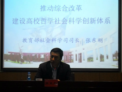 教育部社会科学司司长张东刚在报告中指出,党十七届六中全会和党的十八大报告对高校哲学社会科学创新体系的要求进行科学阐述,推动学术理论体系和学术话语体系建设是建设高校哲学社会科学创新体系的核心,哲学社会科学发展要坚持理论联系实践,建设创新体系要认识实践、了解实践、深入实践,要有实现问题意识的自觉。张东刚强调,推动综合改革,建设高校哲学社会科学创新体系这一目标的实现基于九大体系建设:建设具有中国特色和世界水平的哲学社会科学学科体系和教材体系;建设哲学社会科学研究创新平台体系;建设团队协同攻关与个人自由探索并重的研究项目体系;建设全方位的哲学社会科学服务体系;建设方便快捷、资源共享的哲学社会科学条件支撑体系;建设结构合理的哲学社会科学人才队伍体系;建设“走出去”与“请进来”相结合的对外学术交流工作体系;坚持一手抓繁荣发展,一手抓科学管理,建立健全哲学社会科学管理体系;建设教育、制度、监督、惩治相结合的学风建设工作体系(井冈山研究中心)。