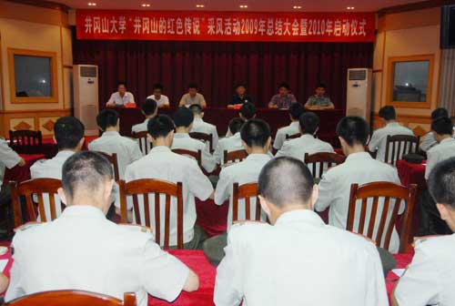 6月24日晚,学校举行“井冈山的红色传说”采风活动2009年总结大会暨2010年启动仪式。校长张泰城出席并讲话。团委书记郭新春主持,中心常务副主任李忠作09年采风活动总结,对今年的采风工作进行部署。井冈山研究中心教师、国防生学院负责人以及选培办干部等参加会议。会议向2009年参与采风的大学生发放了《井冈山的红色传说》第3集。即将参与今年采风活动的全体国防生参加了仪式。参与09年采风活动的教师代表肖子华、学生代表张泾龙,以及将参与2010年采风活动的国防生代表邱蔚琪分别发言。