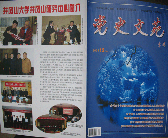 近日,中共江西省委党史研究室主办的《党史文苑》杂志,在2008年12期的封面对我中心进行了介绍,精辟概述了井冈山大学井冈山研究中心的发展历程、组织结构、科研水平、对外交流和社会服务等方面的情况,同时还图文并貌地刊登了领导关怀和举行学术会议的一些照片,让广大读者了解我中心起了很好的宣传作用。